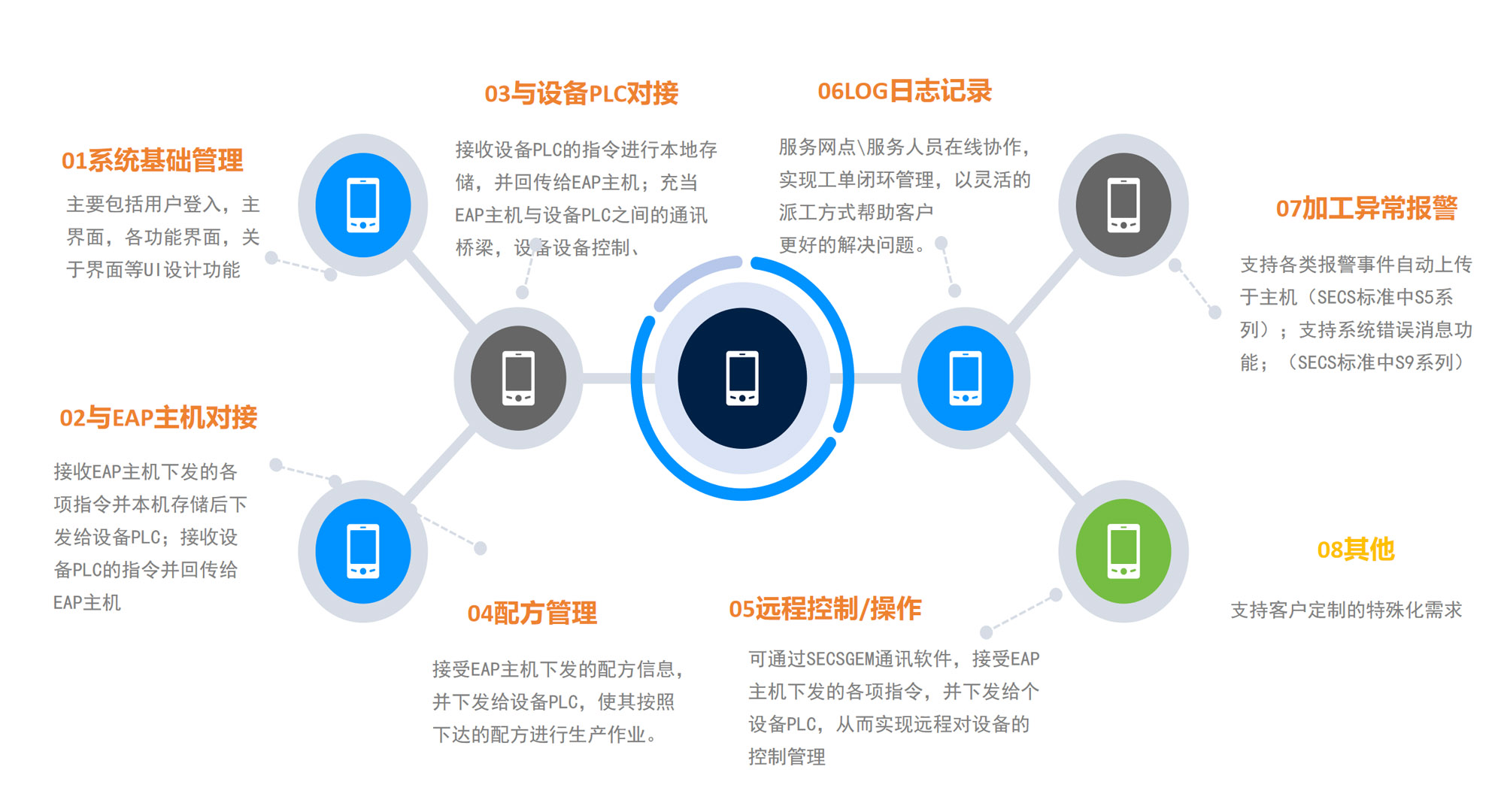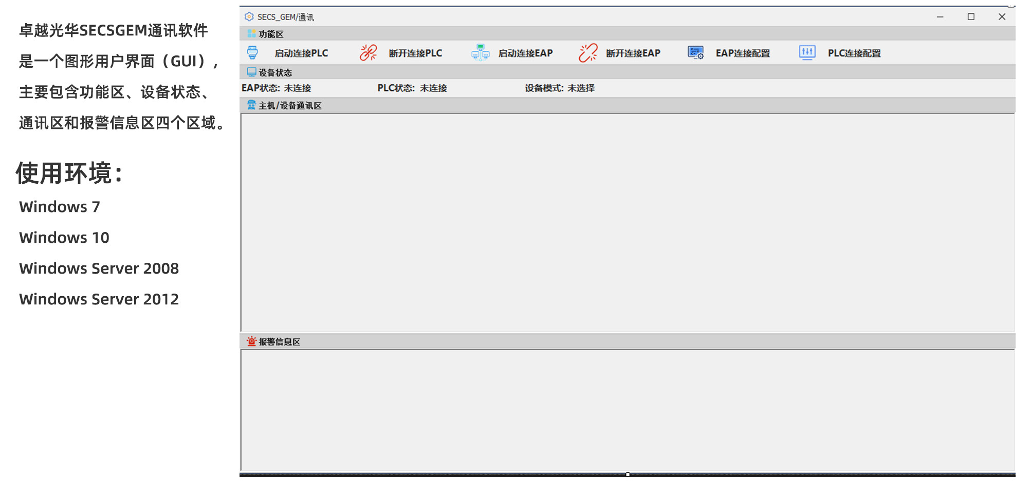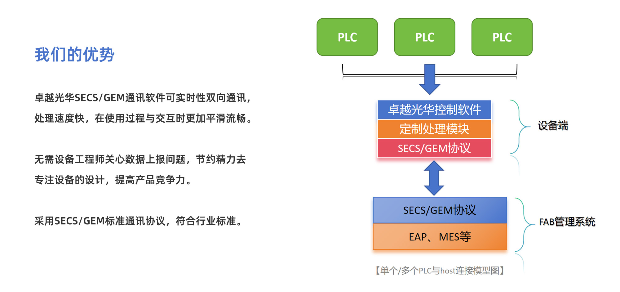卓越光华程序是基于SEMI SECS/GEM标准的通讯开发工具软件,提供灵活高的二次开发接口,可使用户在最短的时间内实现半导体设备与主机间的通讯,支持HSMS(E37),SECS-II,GEM。方案框架如图所示:
